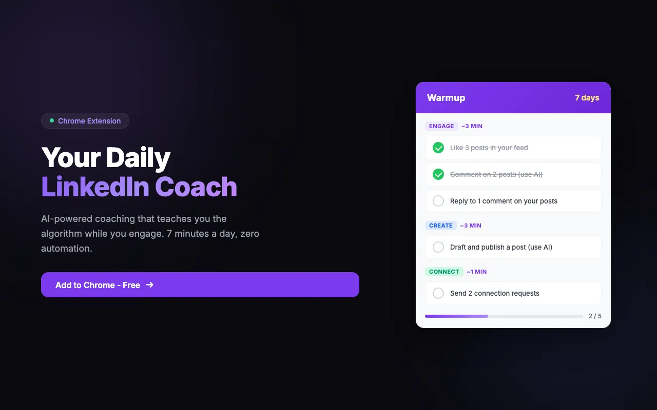 Daily guided checklist. AI post drafter. AI comment suggester. Connection notes. Streak tracking. Algorithm education.